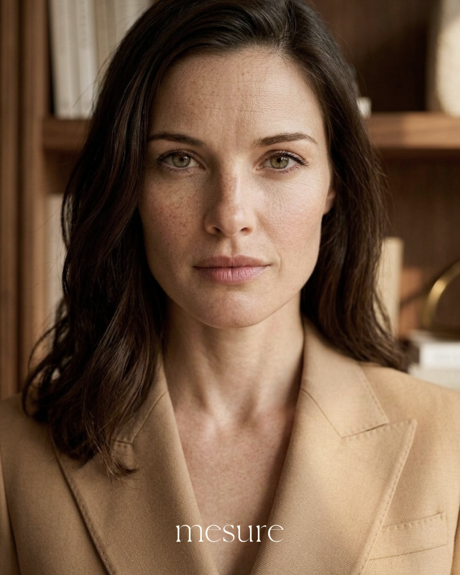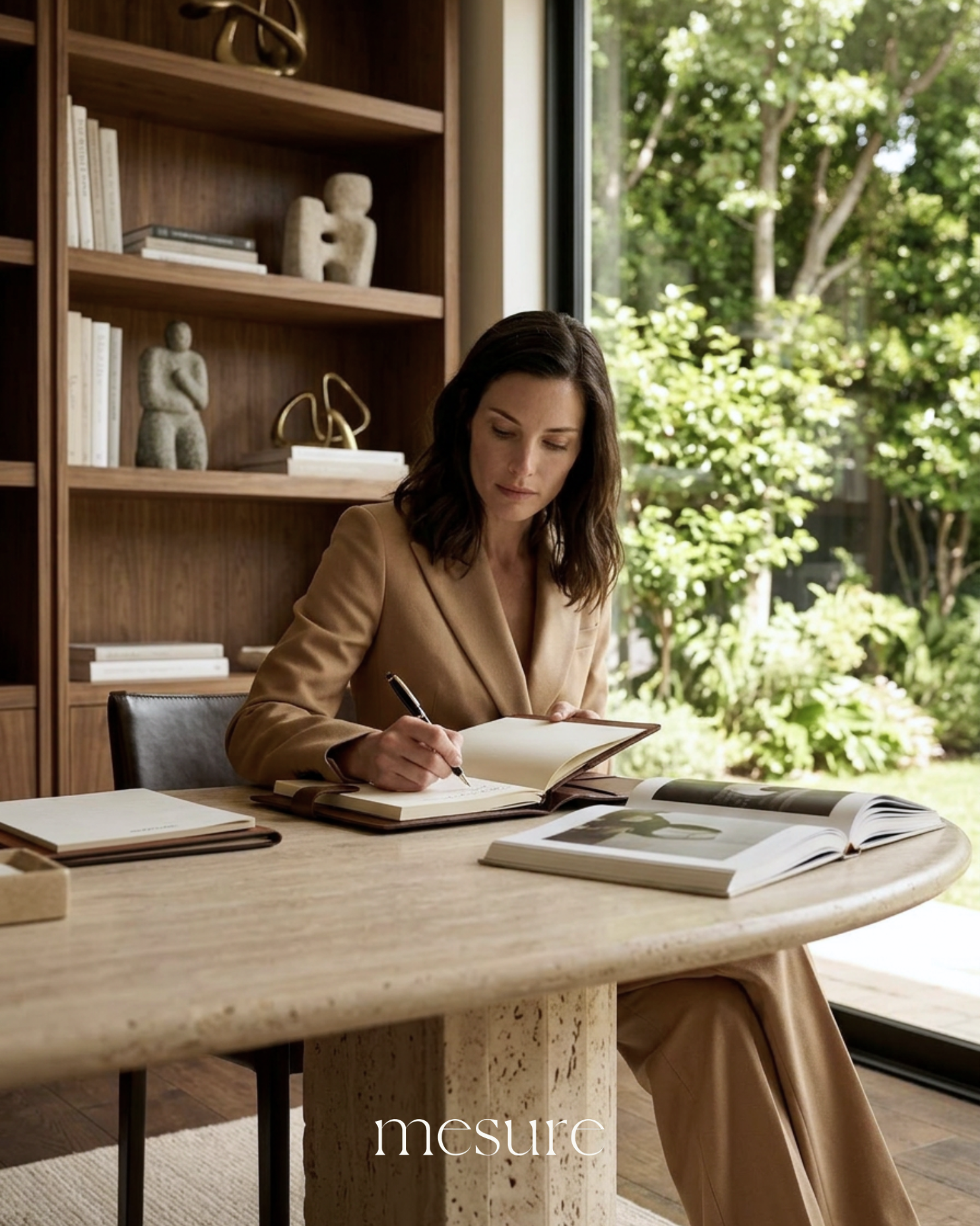 De campagne beelden op deze pagina zijn gemaakt om Mesure's camel wool double-breasted jacket met bijpassende wide trousers met single pleat uit de SS26 collectie te promoten. Geen fotostudio. Geen model geboekt. Wel beelden die passen bij Mesure, die de emotie oproepen bij de Mesure vrouw.